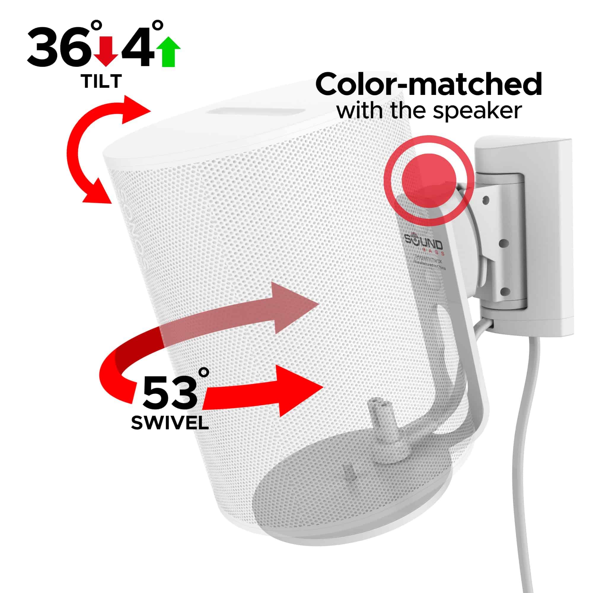 1. INCLINACIÓN Y GIRO PARA AUDIO PERSONALIZADO: Experimenta un control completo sobre tu experiencia auditiva con el amplio rango de giro de 53 izquierda/derecha (pared a pared) y la inclinación de 36 hacia abajo / 4 hacia arriba de nuestro soporte. Ajustes fáciles y sin herramientas permiten una posición de audio personalizada, asegurando la mejor calidad de sonido en cualquier configuración de habitación.